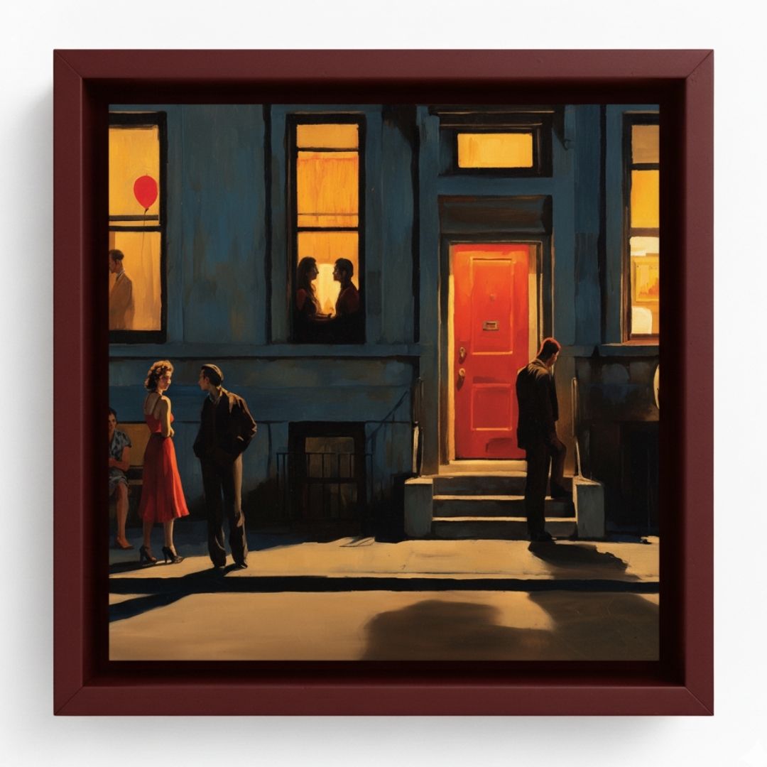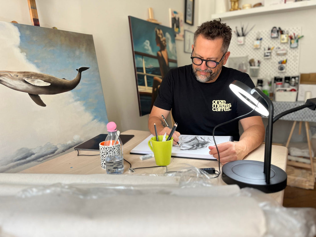 Inspiré par Edward Hopper, Magritte ou encore la symbolique urbaine, il compose des scènes à la fois poétiques et percutantes, où les silhouettes humaines côtoient les animaux et les icônes modernes.