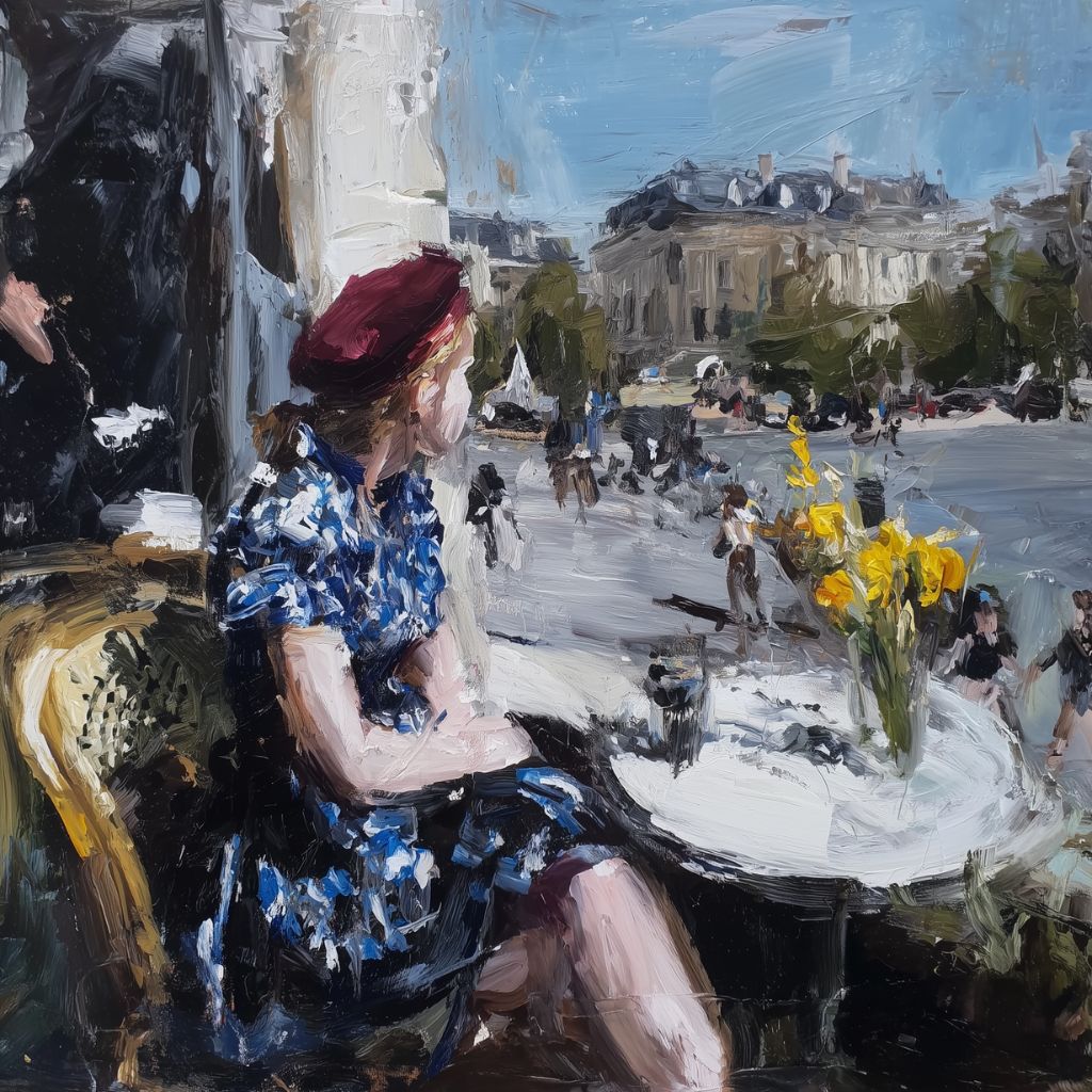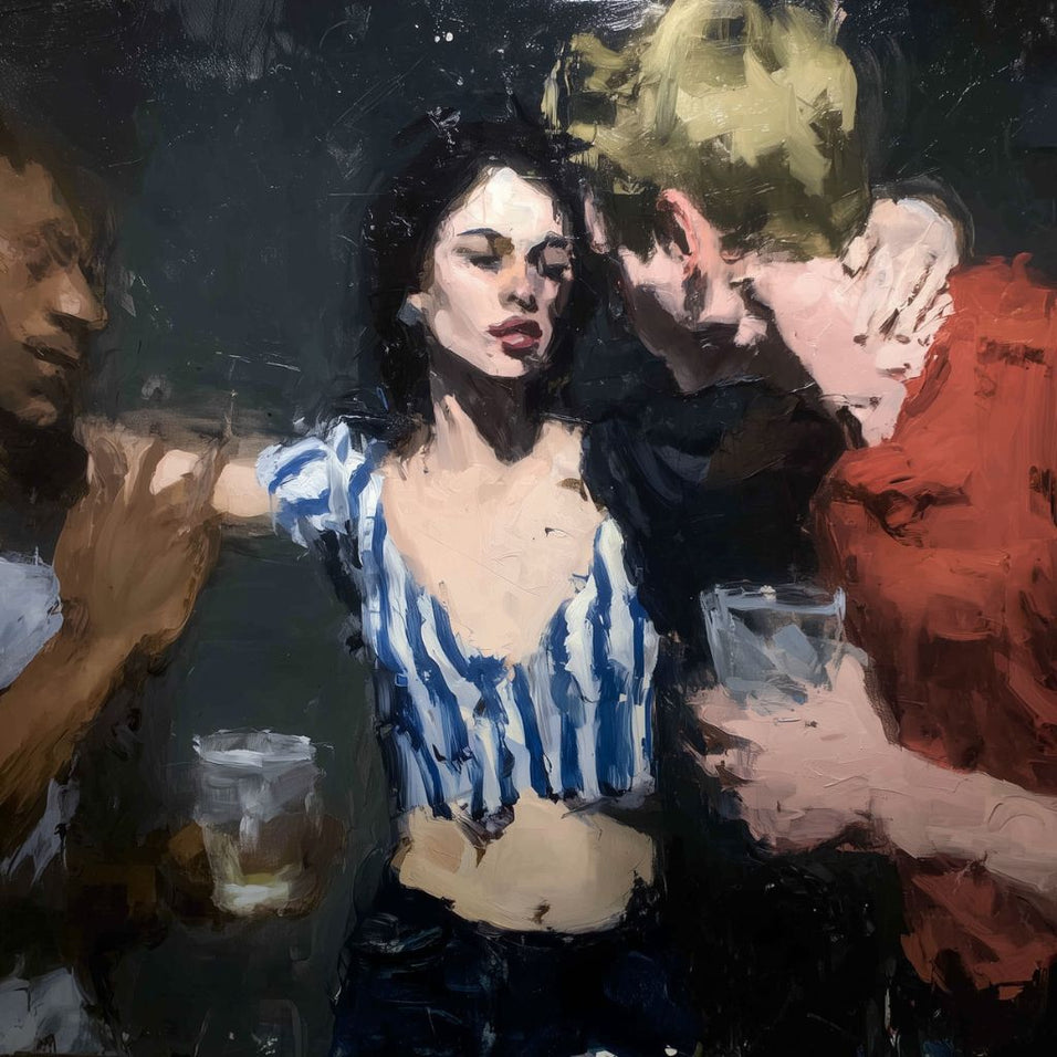 Chaque tableau invite le spectateur à entrer dans une narration ouverte. Ce qui importe n’est pas ce qui est montré, mais ce qui est suggéré : la phrase non dite, le geste interrompu, l’histoire qui se devine au-delà du cadre.